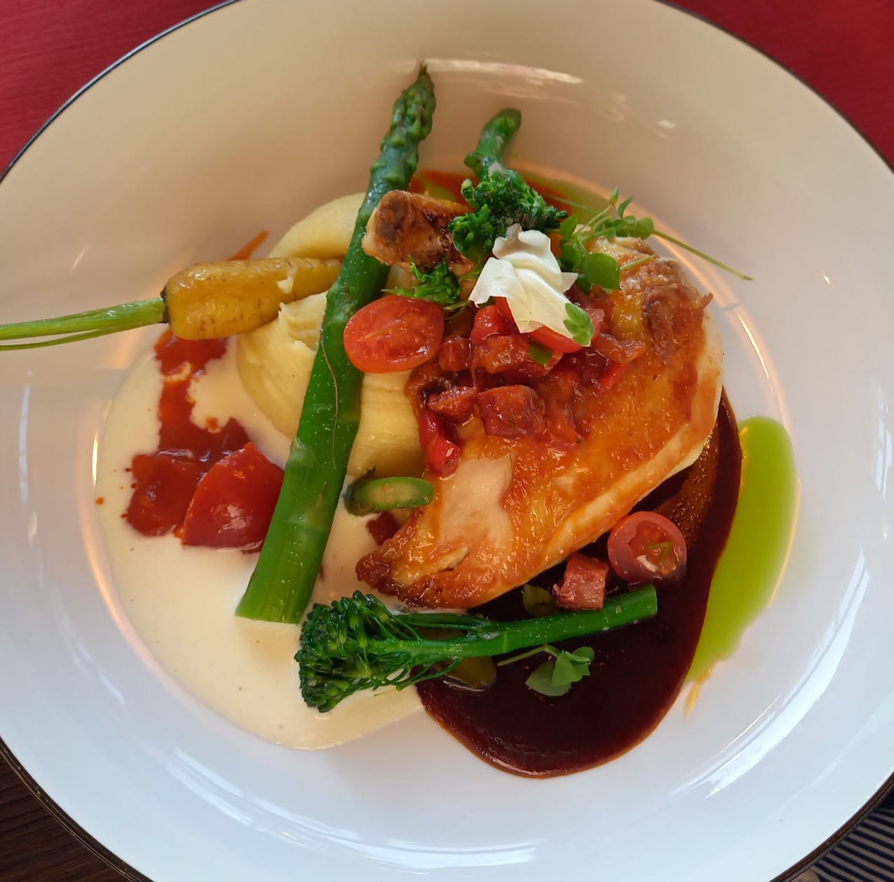 Kartoffelpüree | Butterschaum | Saison-Gemüse | Bacon-Kräutercrumble